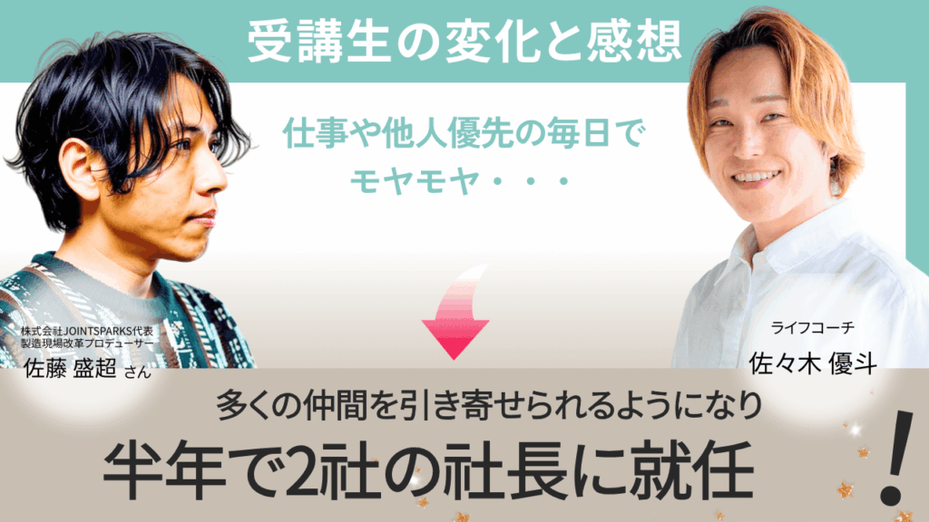 【受講生インタビュー】仕事や他人優先の毎日でモヤモヤ→多くの仲間を引き寄せられるようになり、半年で2社の社長に就任!佐藤盛超さんのストーリー
