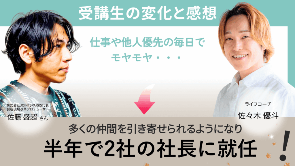 仕事や他人優先の毎日でモヤモヤ→多くの仲間を引き寄せられるようになり、半年で2社の社長に就任!佐藤盛超さんのストーリー